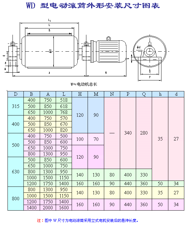 (1).因目前外裝式電動(dòng)滾筒尚未制定相關(guān)行業(yè)標(biāo)準(zhǔn),本廠將該型號(hào)電動(dòng)滾筒首位代號(hào)用W(“外裝”的首位漢語拼音)表示。外裝式電動(dòng)滾筒外置電機(jī)可分為立式電機(jī)和臥式電機(jī),用戶訂購時(shí)請加以說明;